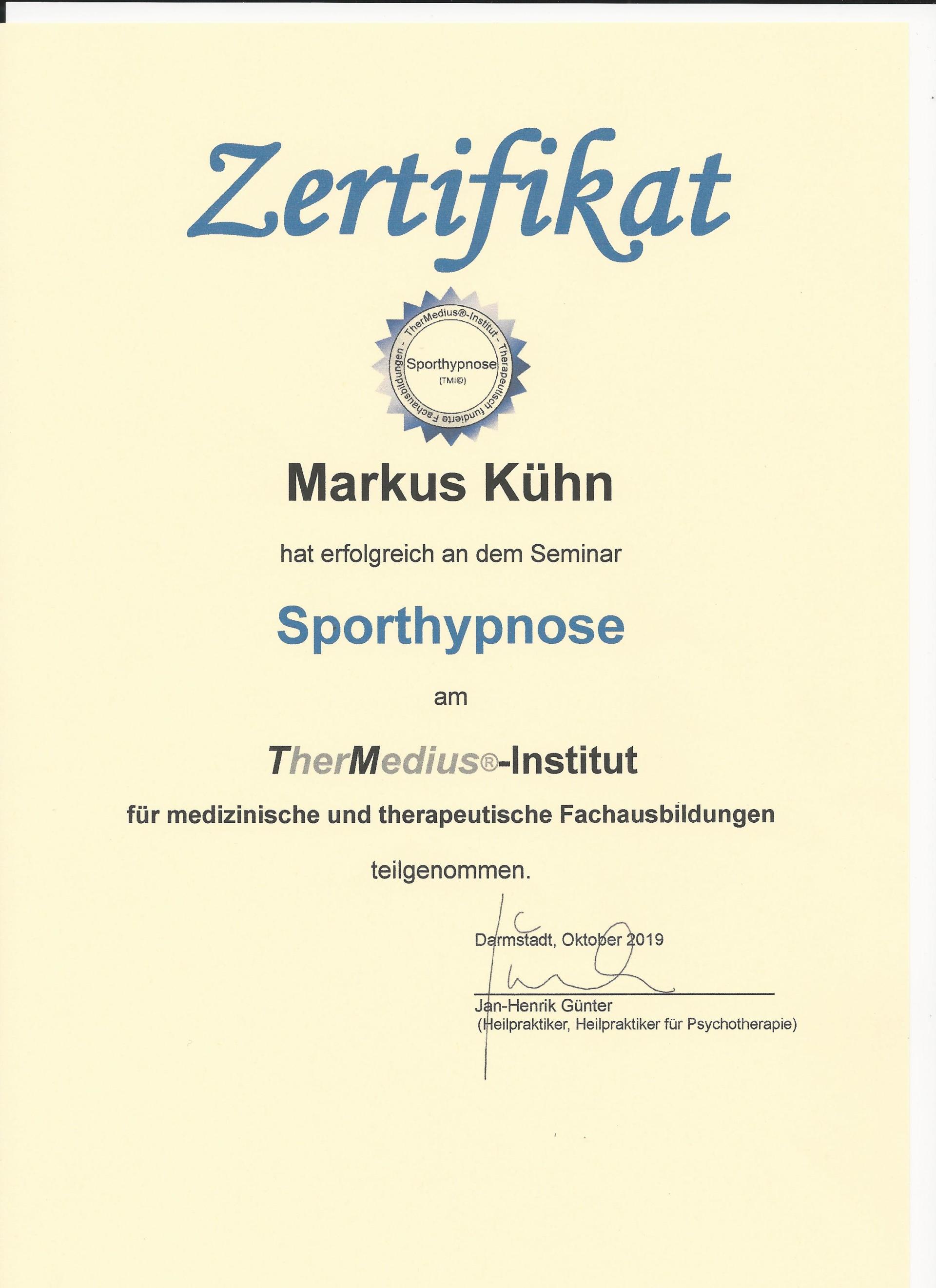 Markus Kühn, passionierter Sportler und früher erfolgreicher Schwimmer, trainierte als Inhaber eine B-Trainerlizenz im Bereich Leistungssport Schwimmen lange sehr erfolgreich die Leistungsgruppe eines Schwimmvereins. Seine Schützlinge können unter anderem Erfolge bei den Deutschen Jahrgangsmeisterschaften sowie diverse Titel auf Landesebene vorweisen. Davor war Markus Kühn Trainer einer Basketball-Jugendmannschaft. Er spielt seit seiner Jugend leidenschaftlich E-Gitarre und kennt die Herausforderungen ambitionierter Musiker. Überdies ist er ausgebildeter Hypnotiseur (TMI) mit einer Zusatzausbildung Sporthypnose.